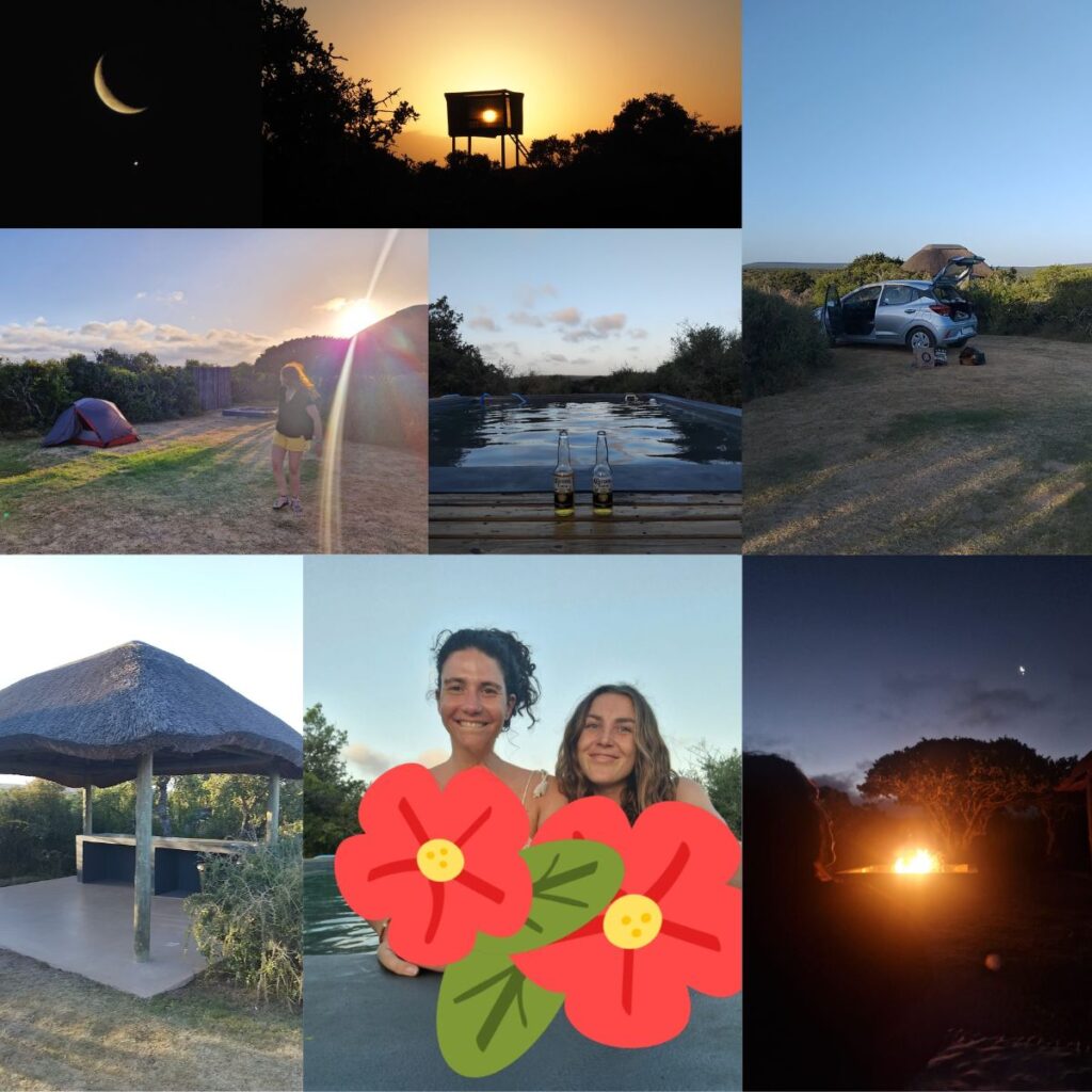 Planning idéal : Location de la voiture vers 16h à Jeffrey’s Bay, arrivée au camping vers 18h, soirée coucher de soleil et piscine. Lever vers 5h pour le lever du soleil, safari de 7h à 12h (l’été, il fait trop chaud ensuite), puis retour à Jeffreys’ Bay.